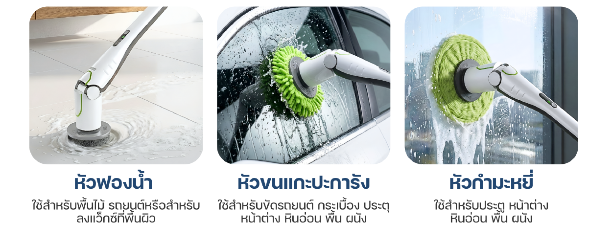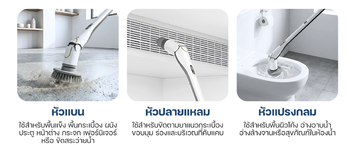 • 🟠 แปรงกลม: ใช้สำหรับพื้นผิวโค้ง อ่างอาบน้ำ อ่างล้างจาน หรือสุขภัณฑ์ในห้องน้ำ