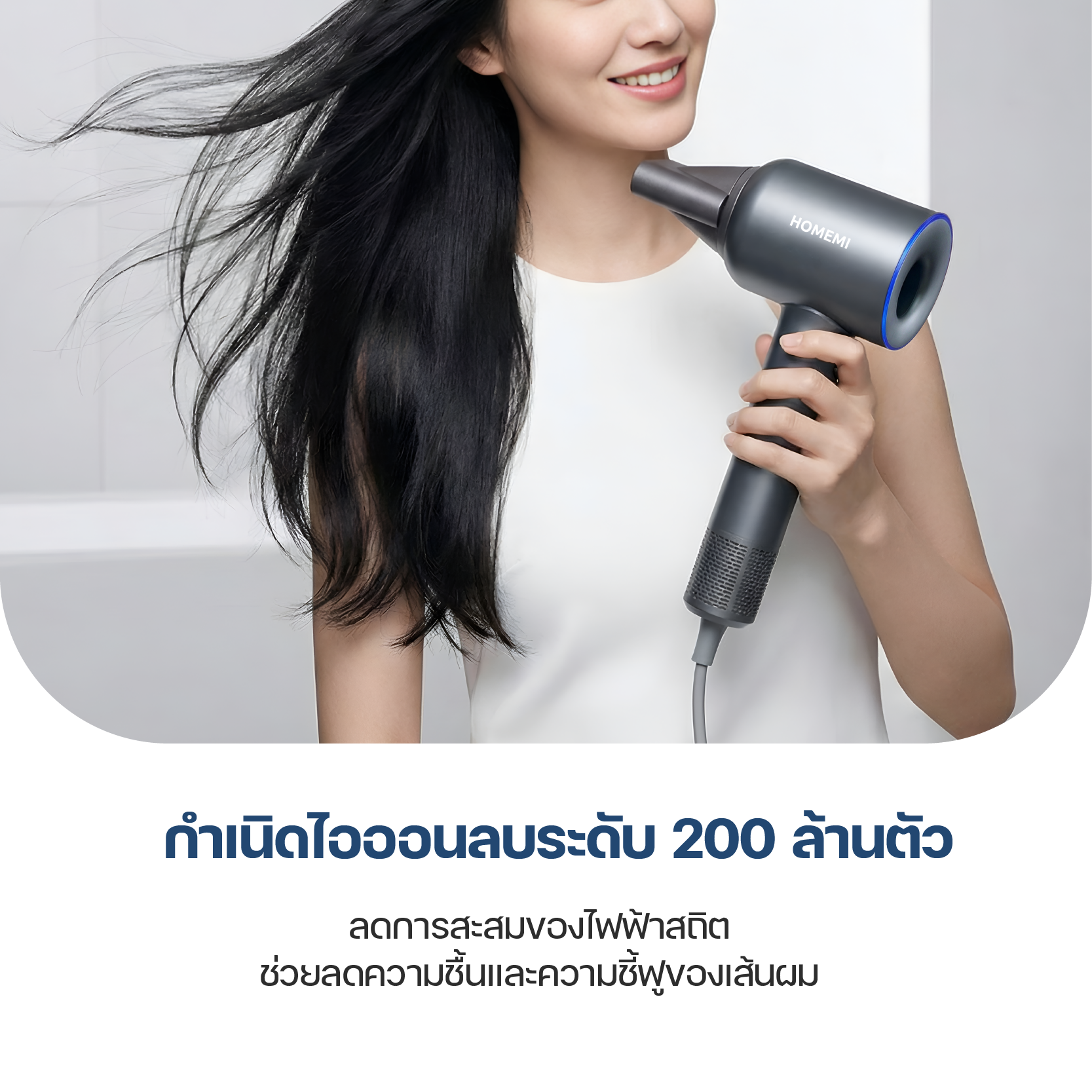 💎 ปล่อยไอออนลบ 200 ล้านตัว ลดผมชี้ฟู ลดไฟฟ้าสถิต ผมเรียบลื่น เงางาม สุขภาพดี