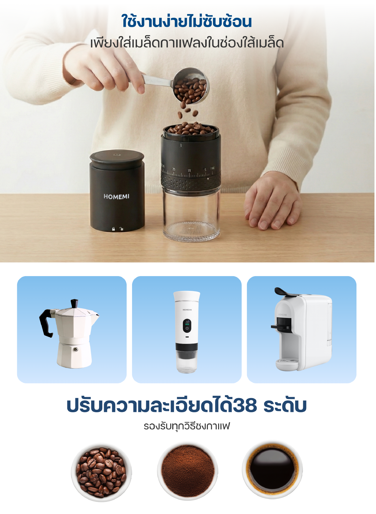 - บดกาแฟได้อย่างแม่นยำ ปรับระดับความละเอียดได้ถึง 38 ระดับ รองรับทุกวิธีชง ตั้งแต่เอสเปรสโซไปจนถึงเฟรนช์เพรส